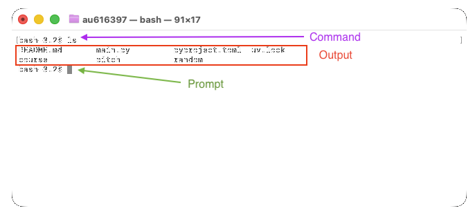 We will use terminal through short commands, such as ls (short for list) that lists files and folders, see Figure 2.
