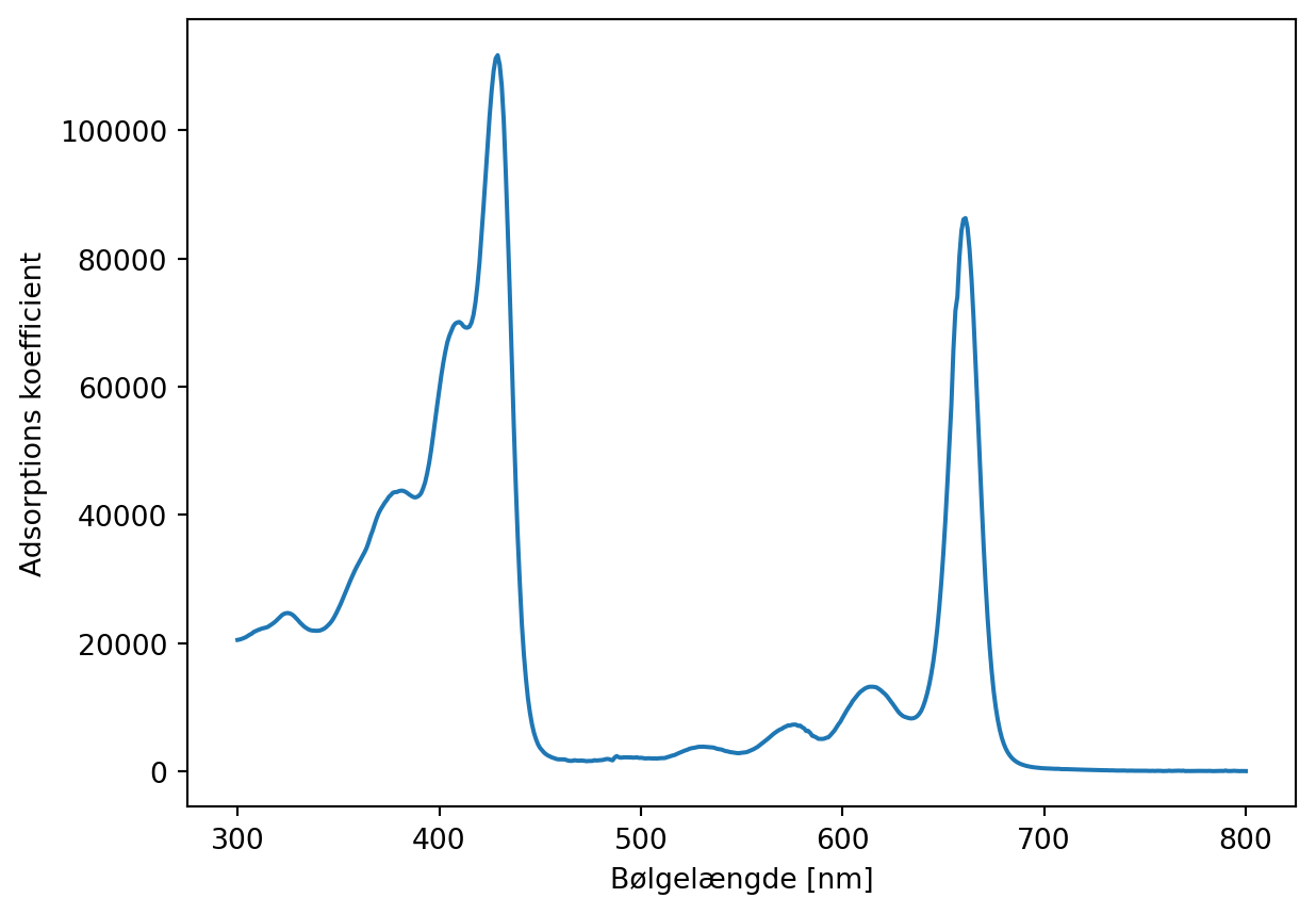 Vi har tidligere kigget på et datasæt omkring adsorption spektrummet af chlorophyll,