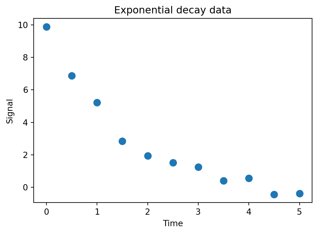 signal = A_true * np.exp(-k_true * t) + np.random.normal(0, 0.3, len(t))