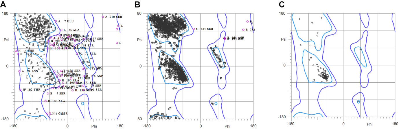 Ramachandran-plot for de tre strukturer er mærket A, B, og C og vist herunder.