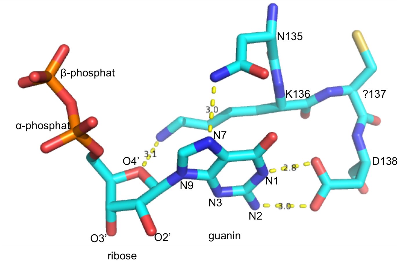 Alle GDP-bindende proteiner indeholder et bestemt sekvensmotiv, Asn-Lys-X-Asp (NKXD), og i strukturer af GDP-bindende proteiner finder man at sidekæderne i motivet er ansvarlige for genkendelse af selve guaninbasen. I figuren nedenfor ses et udsnit af det GDP-bindende protein EF-Tu (Elongeringsfaktor Tu), som viser bindingen af guanin- og ribose-delen af GDP (carbon - turkis, nitrogen – blå, oxygen - rød, svovl – gul, phosphor - orange, stiplede gule linjer viser hydrogenbindinger med angivelse af donor-acceptor afstand).