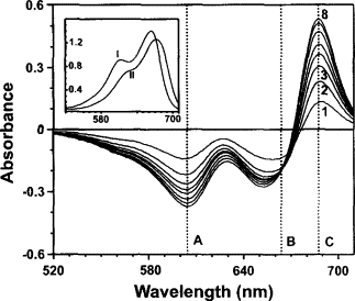 Methylenblåts absorptionsspektrum ændres markant når det binder til RNA, som vist i figuren nedenfor, hvor den lille, indsatte figur viser spektre for RNA-bundet (II) og frit methylenblåt (I) og den store figur differensspektre for forskellige koncentrationer af RNA (tallene 1-8 på graferne angiver at der er tilsat mellem 0.1 og 0.8 mg/ml):