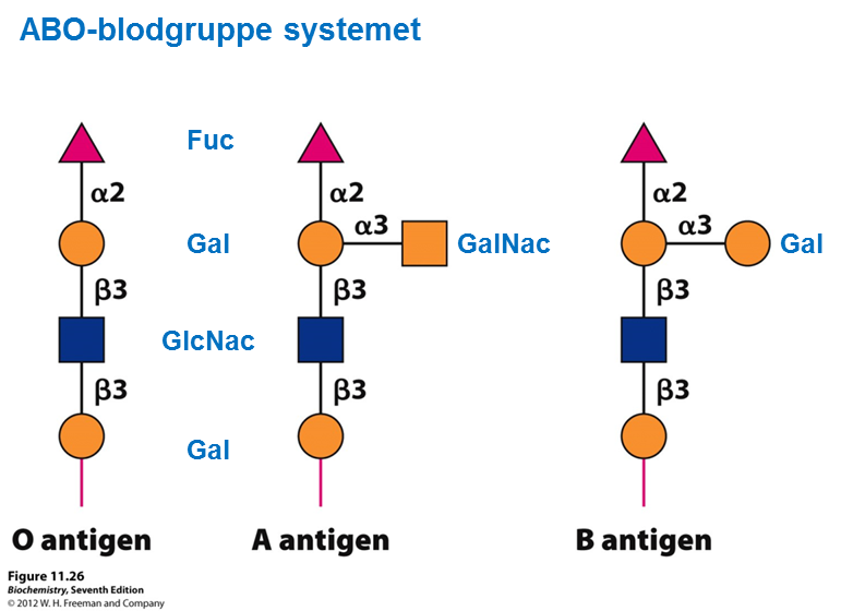 Hos mennesket udgør en lille gruppe af O-bundne oligosaccharider, som vist på figuren, blodtypesystemet AB0, hvor man som individ kan være af typen (og dermed udtrykke antigenerne) 0, A, B eller AB.