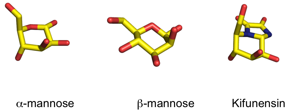 Nedenfor er vist strukturen af alpha-D-mannopyranose, beta-D-mannopyranose og kifunensin.