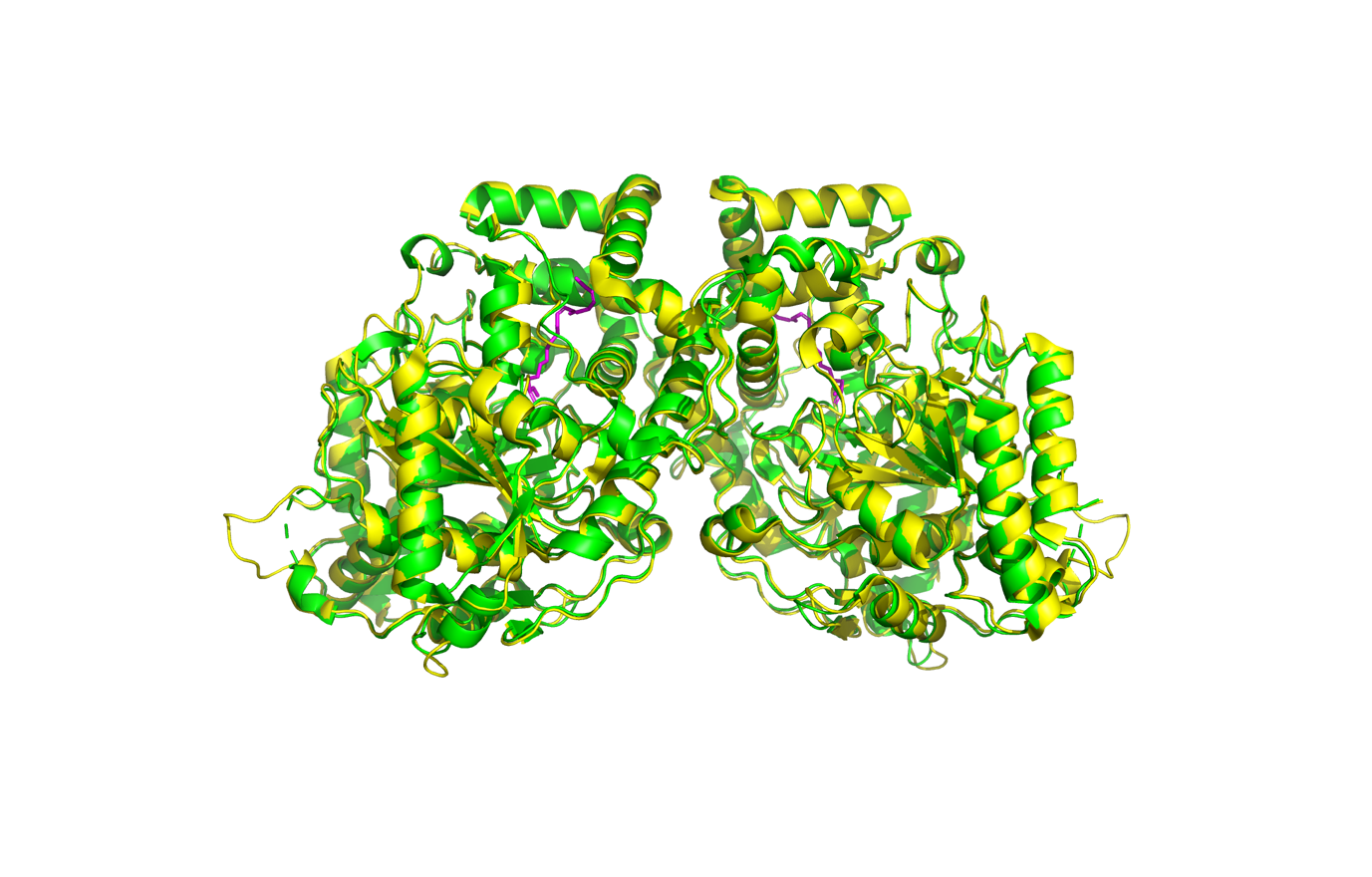 Spørgsmål 2. Opskriv et PyMOL-script, der henter de to strukturer fra PDB, danner et objekt der kun indeholder kæderne A og B fra 6DII og overlejrer dette objekt på 6DHV med benyttelse af kun Cα-atomer og til sidst viser de to overlejrede strukturer i “cartoon” med inhibitoren i sticks. 6DII skal være gul, 6DHV grøn og inhibitoren magenta. Dit svar skal indeholde PyMOL-script, det endelige billede og RMSD-værdien for overlejringen.