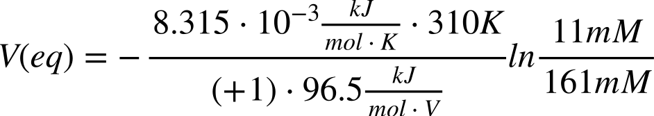Spørgsmål 2. Beregn ligevægtspotentialet for Na+ i menneskets nerveceller ved koncentrationer inde i cellen på 11 mM og udenfor cellen på 161 mM.