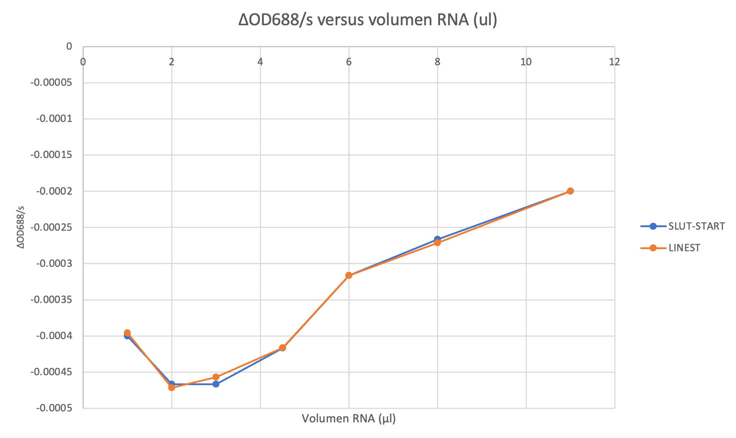 Svar: Kurven har et minimum ved ca. 2-3 µl tilsat RNA. Afhænger af om man beregner hældning vha. regression (LINEST) eller bare slut minus start OD: