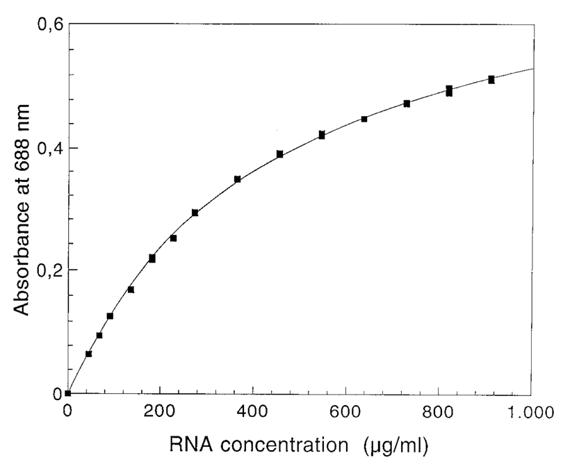 Effekten af RNA-koncentrationen på absorbansen af methylene blue blev også undersøgt af forfattere i et publiceret studie (Greiner-Stoeffele, T., Grunow, M., Hahn, U. “A general ribonuclease assay using methylene blue”, Anal Biochem (1996) 240(1):24-8), hvor man tilsatte forskellige mængder af RNA til en fast mængde methylene blue og målte absorbansen:
