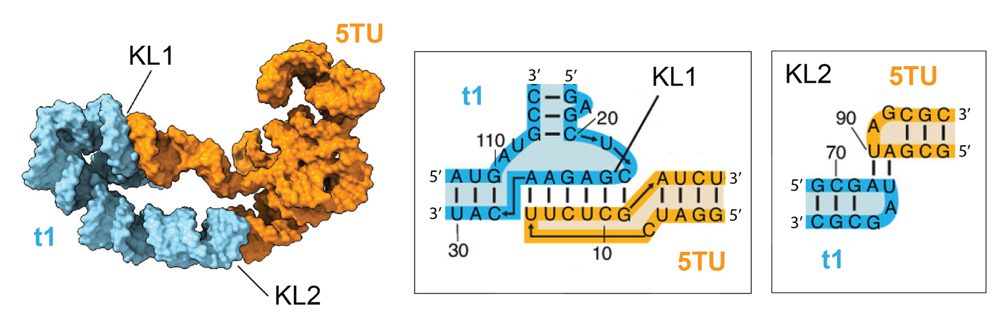 I følge RNA-verden-hypotesen opstod livet ved at et RNA-molekyle begyndte at kopiere sig selv, men et sådant RNA-molekyle er endnu ikke fundet i naturen. Forskere har derfor brugt kunstig (in vitro) evolution til at udvikle et fungerende RNA polymerase ribozym (RPR) ud fra randomiserede sekvenser. Strukturen af RPR blev bestemt med cryo-elektronmikroskopi og viste sig at bestå af to RNA-molekyler (5TU og t1) holdt sammen af interaktioner på to steder, KL1 og KL2, som vist nedenfor.
