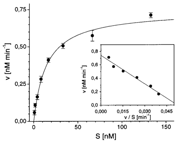 Det indsatte plot er et såkaldt Eadie-Hofstee diagram, hvor den katalytiske parameter Km kan bestemmes som den negative hældning (“minus hældningen”).
