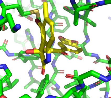 Bindingsstedet for inhibitoren er lokaliseret i interface mellem det N-terminale domæne og det nukleotidbindende domæne, vist nedenfor til venstre. Til højre ses det samme udsnit af strukturen af det tilsvarende enzym fra mennesker, HsUAP. Strukturen af HsUAP er vist overlejret med TbUAP, men kun inhibitoren af TbUAP ses.